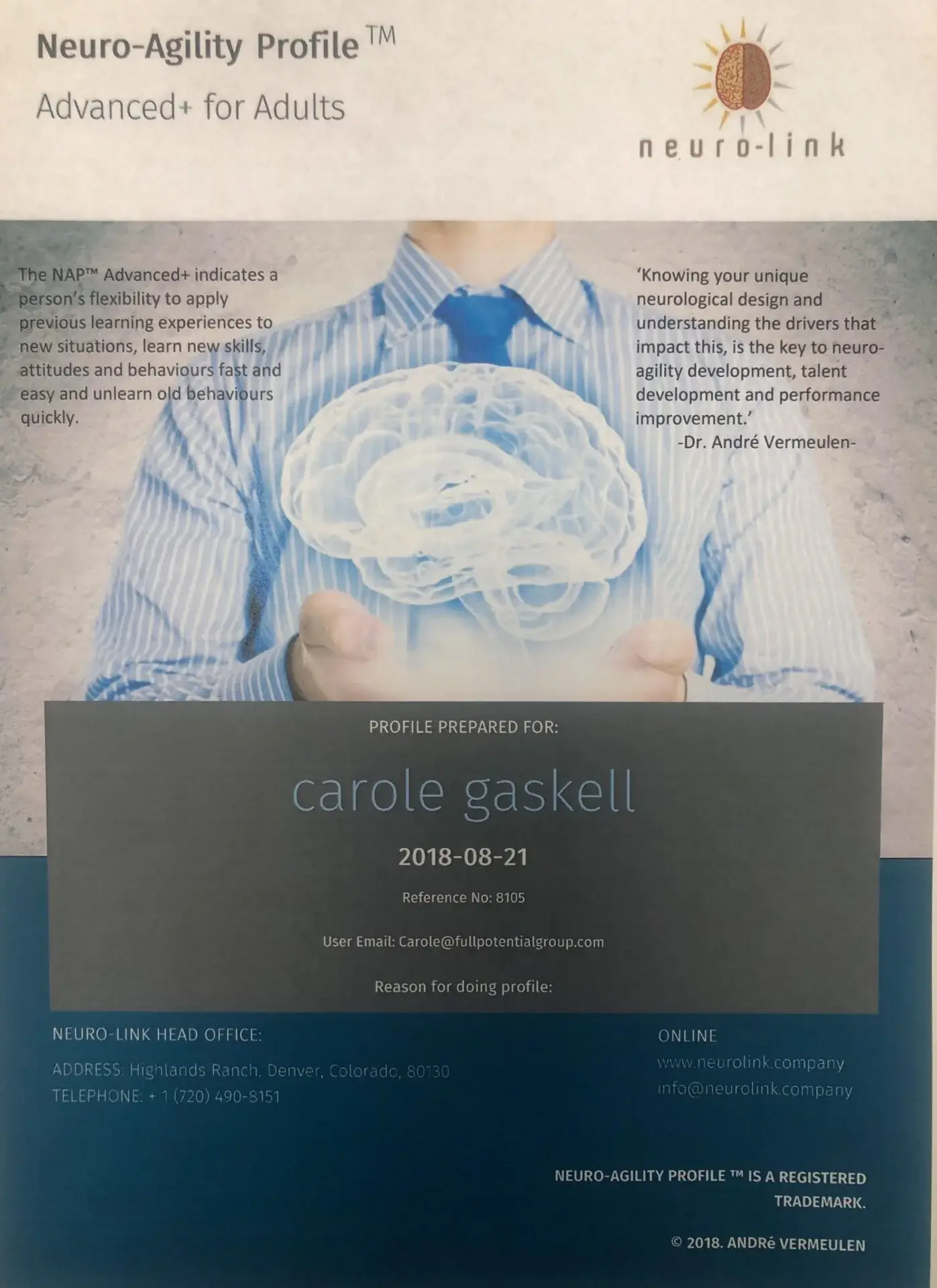 Neuro-agility helps you boost performance and wellbeing, improve the way you learn, minimise your potential for risk, improve your adaptability and brainpower so you can out-think, out-create and out-perform. Developed by neuro-scientist, Dr Andre Vermeulen, Neuro-agility is a trackable, measurable tool that helps individuals and teams work simpler, better, faster, by becoming more brain fit. The Neuro-agility Profile enables you to understand 7 facets of your own neuro-design and measure drivers to boost your flexibility, agility and performance. Questionnaire – 180 easy questions (takes 40 minutes to complete). Pre-recorded debrief that you can watch in your own time.